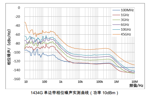 1434系列信號發(fā)生器輸出信號純凈。單邊帶相位噪聲優(yōu)于-122dBc/Hz(1GHz載波,10kHz頻偏),5GHz非諧波小于-70dBc,10GHz諧波小于-55dBc。